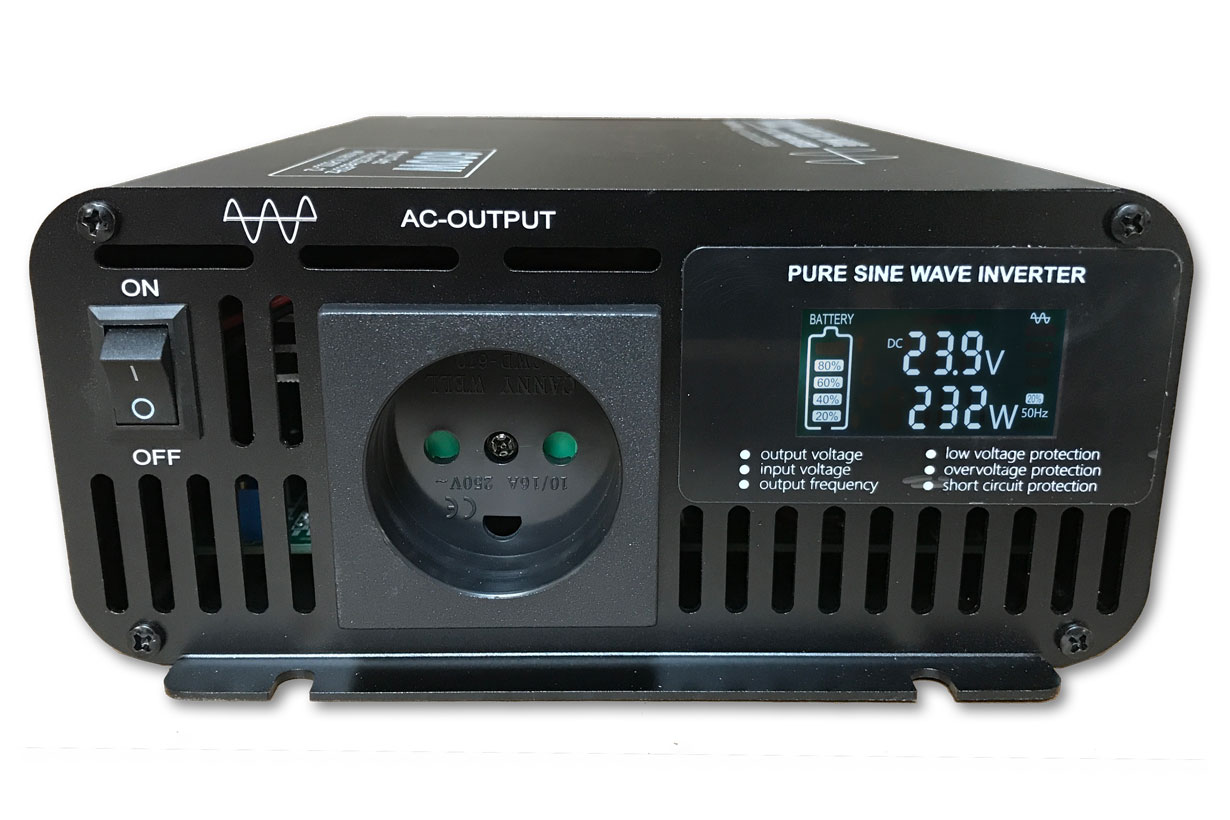 Effektiv Ren Sinus inverter 24 V -> 230 V, 1500 Watt til 24 V batterier er en omformer til batteridrevet solcelleanlæg. I kolonihavehus, båd, campingvogn, autocamper, lastbiler, hytte, sommerhus. Kan forsyne køleskab med kompressor, TV, radio, elektriske have værktøj, plæneklipper, mobilopladning, mm.