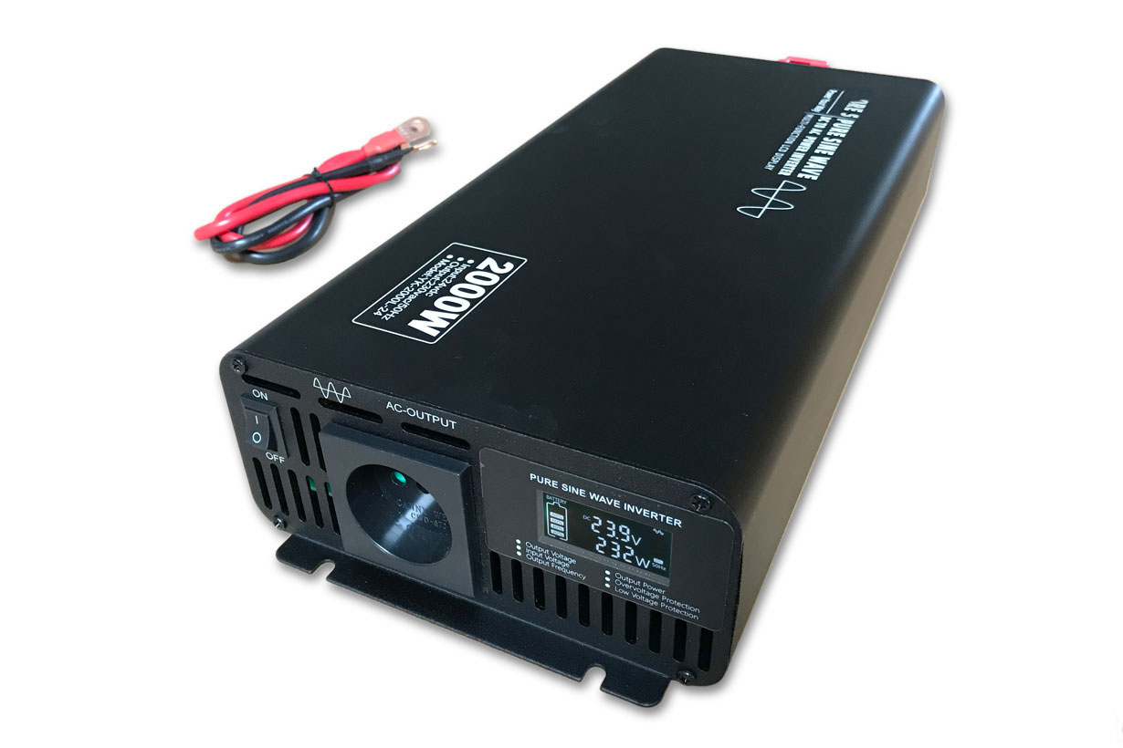 Effektiv Ren Sinus inverter 24 V -> 230 V, 2.000 Watt til 24 V batterier er en omformer til batteridrevet solcelleanlæg. I kolonihavehus, båd, campingvogn, autocamper, lastbiler, hytte, sommerhus. Kan forsyne køleskab med kompressor, TV, radio, elektriske have værktøj, plæneklipper, mobilopladning, mm.