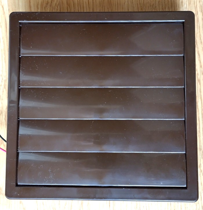 Lamelventil BRUN 170 x 170 mm med indbygget 1 W /12 V ventilator, til udendørs montering. Lamellerne åbner sig når ventilatoren blæser og lukker sig igen hvis ventilatoren stå stille. Kan bruges i alle solcelle ventilator – kit for at forhindre at luften udefra kommer ind i huset hvis blæseren står stille.